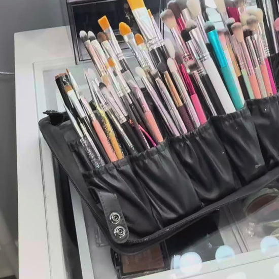Hold 40+ brushes in elastic pockets that actually fit your favorite tools, then zip it closed and toss it in your bag.